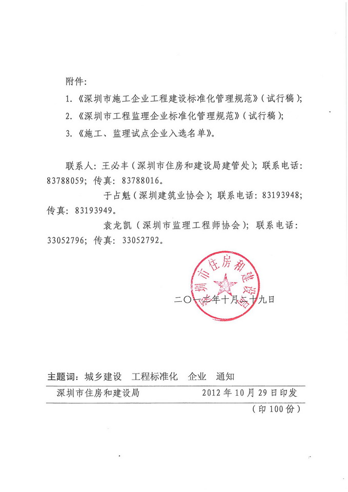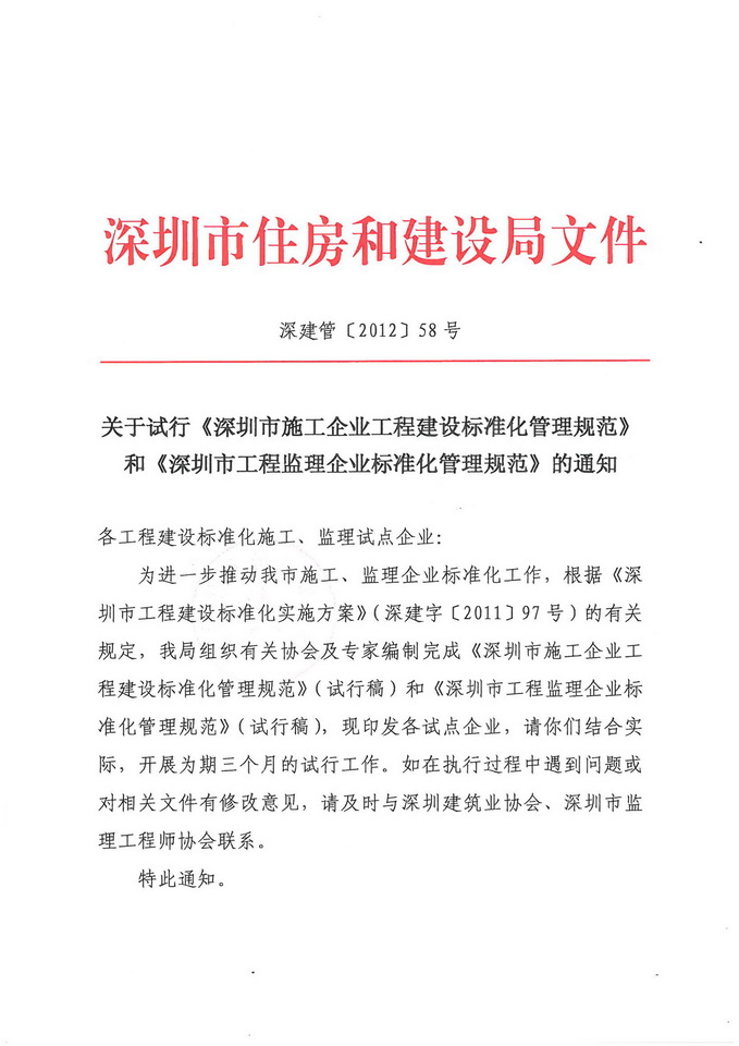 市住建局:关于试行《深圳市施工企业工程建设标准化管理规范》和《深圳市工程监理企业标准化管理规范》的通知